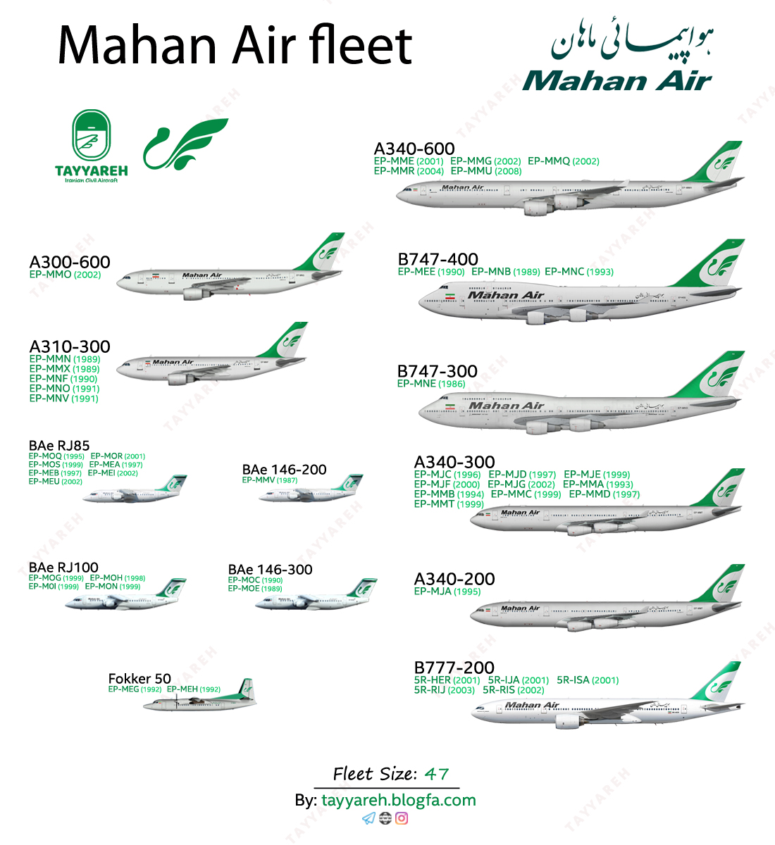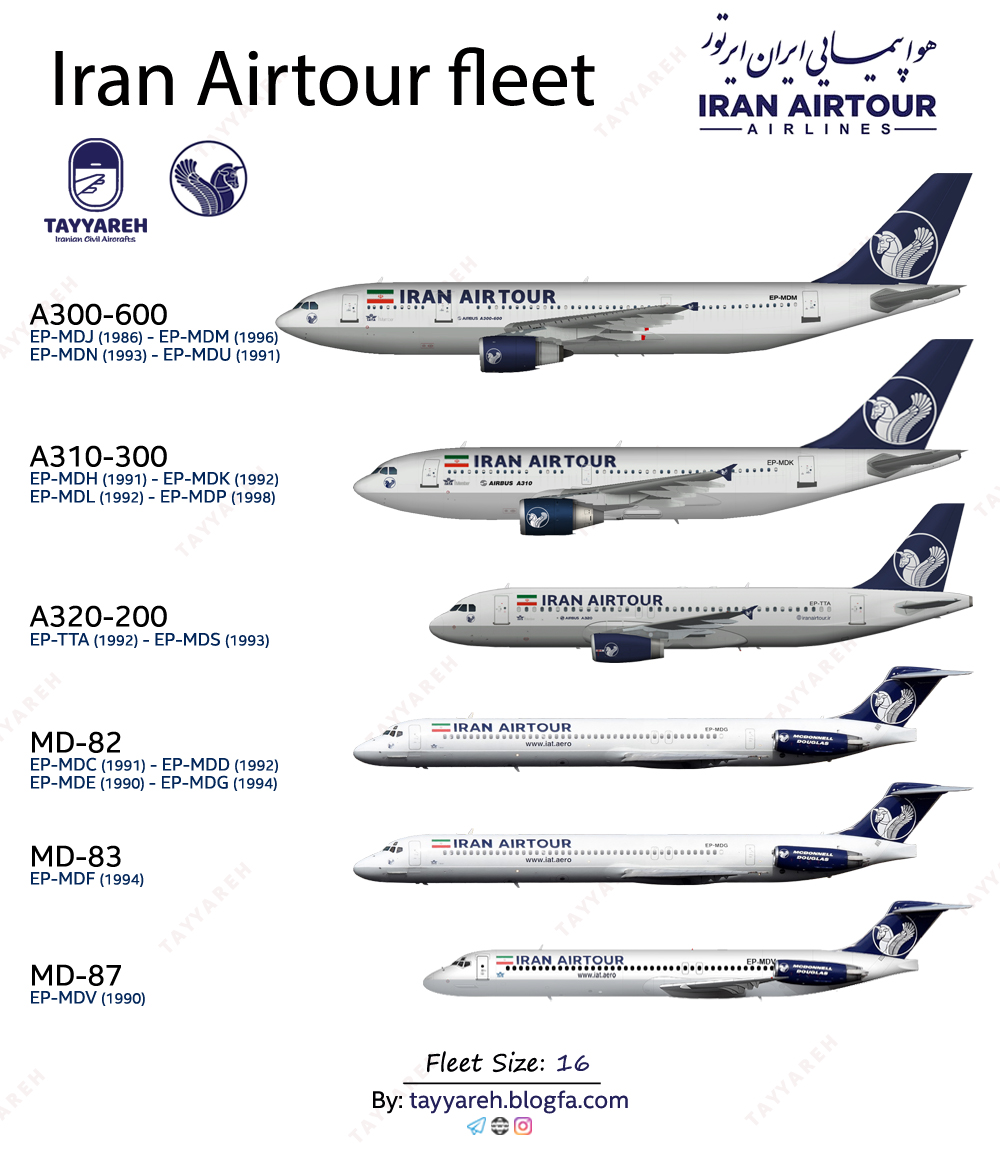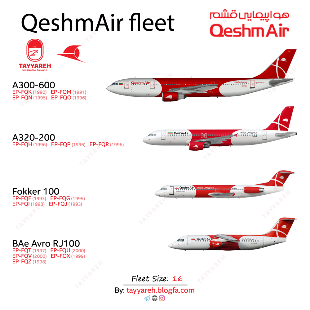 توضیح: هواپیماهای فعال با رنگ آبی، هواپیمای زمینگیر با رنگ قرمز و هواپیماهای از رده خارج با رنگ خاکستری مشخص شدهاند.