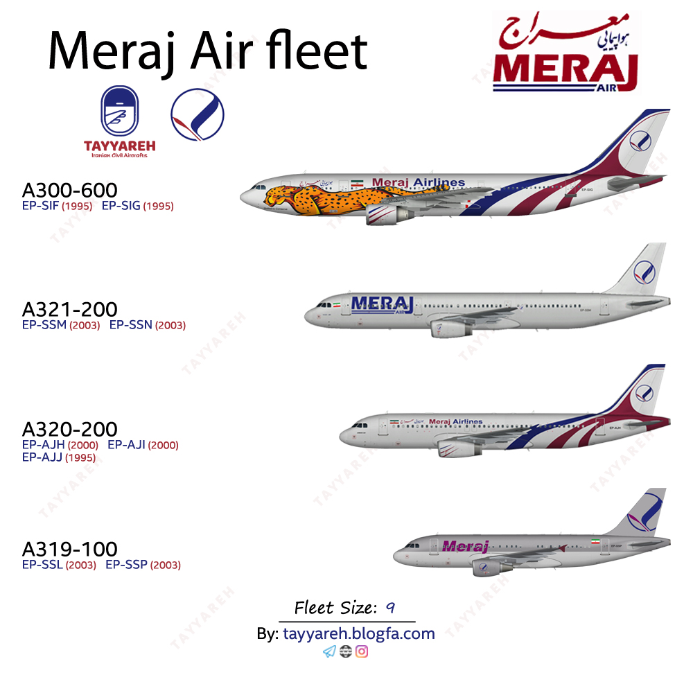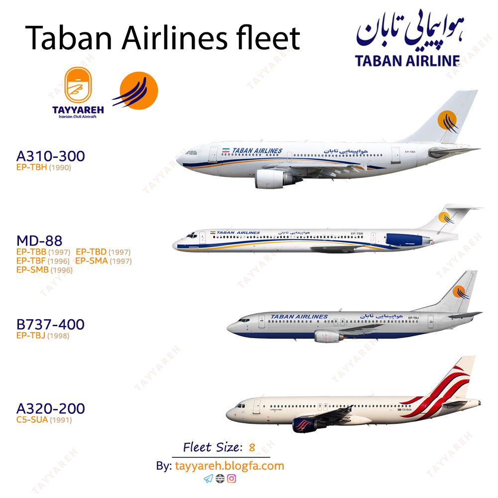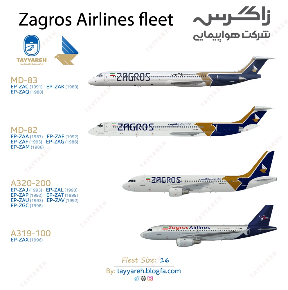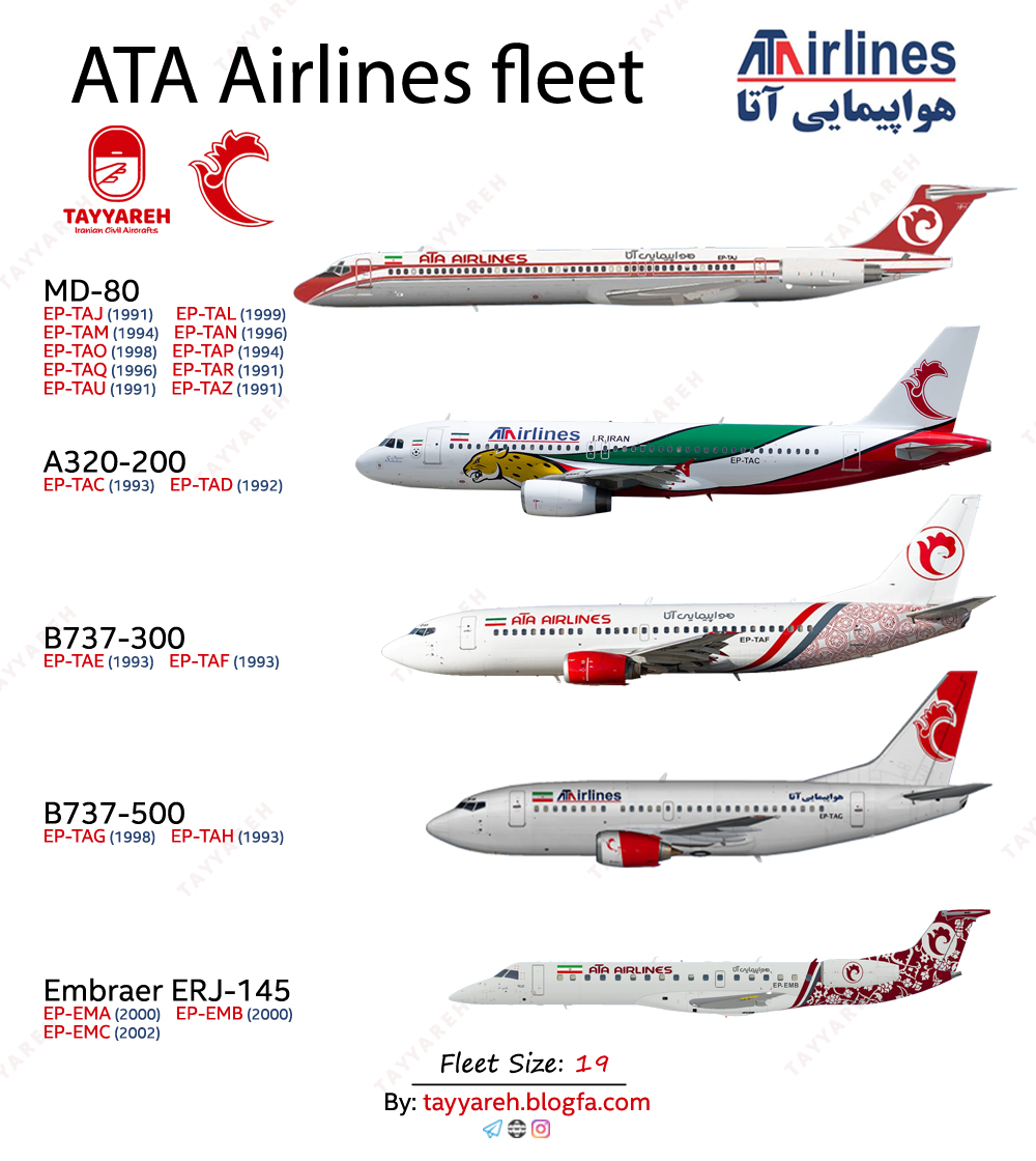 توضیح: هواپیماهای فعال با رنگ آبی، هواپیمای زمینگیر با رنگ قرمز و هواپیماهای از رده خارج با رنگ خاکستری مشخص شدهاند.
