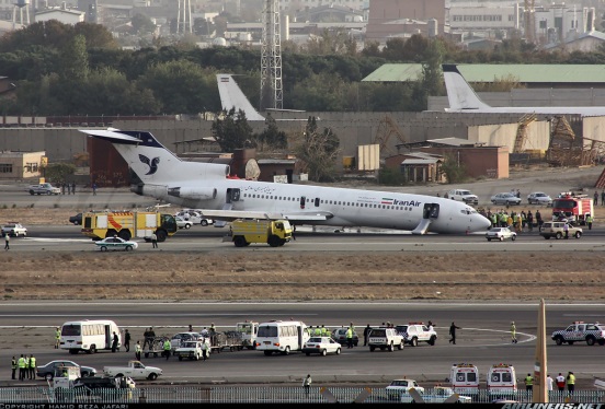 ـ روز سهشنبه 26 مهر 1390 این هواپیما با 97 مسافر و 19 خدمه با هدایت کاپیتان هوشنگ شهبازی، فرودگاه مسکو را به مقصد تهران ترک کرد. در فاصله 15 مایلی فرودگاه امام خمینی، کادر پرواز متوجه باز نشدن چرخ دماغه هواپیما میشوند و تلاش آنها برای حل این مشکل بینتیجه میماند. به جهت تسهیل امدادرسانی به مسافران، خلبان پس از کسب مجوزهای لازم به سمت فرودگاه مهرآباد تغییر مسیر میدهد و به واسطهٔ مهارت خلبان، هواپیما بدون چرخ دماغه بر روی باند 29 چپ فرودگاه مهرآباد به سلامت به زمین مینشیند و مسافران بدون هیچگونه آسیبی از هواپیما خارج میشوند. خسارت وارده بر بوئینگ 727 بسیار کم گزارش شد و هواپیما از 8 اردیبهشت 1391 مجددا به خط پرواز برگشت.