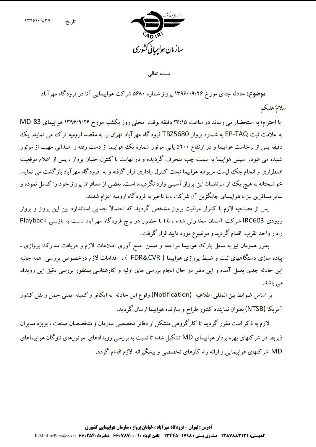 گزارش سازمان هواپیمایی کشوری از حادثه جدی این هواپیما در آذر 1396