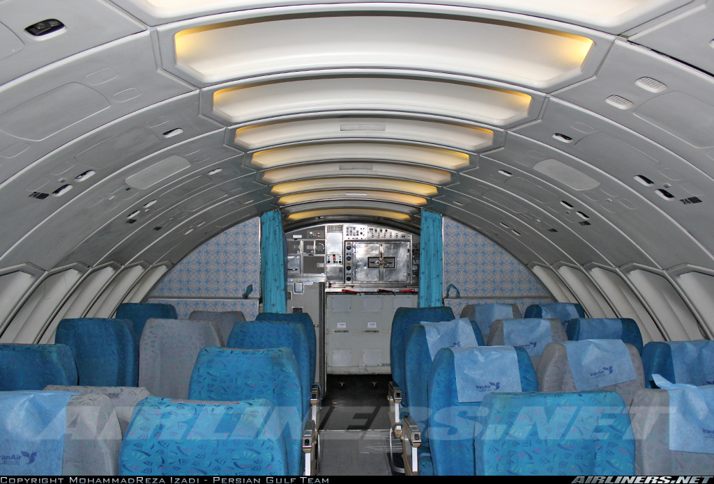کابین اکونومی طبقه بالای هواپیما / آشپزخانه این طبقه نیز در انتهای تصویر پیداست