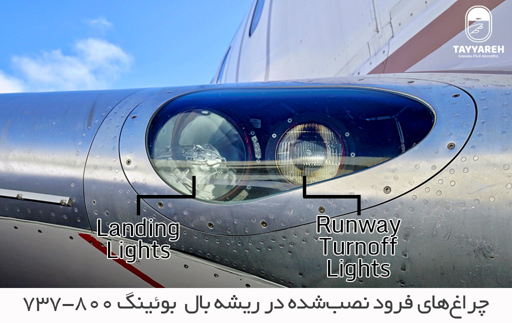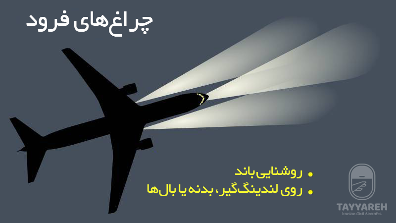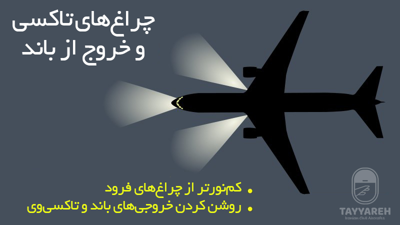 (چراغهای تاکسی و خروج از باند در بالا و چراغهای فرود در پایین)