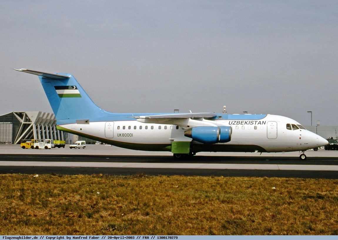 این هواپیما با شماره سریال E2312 در تأسیسات Woodford Aerodrome در منچستر ساخته شد و نخستین پرواز خود را در تاریخ 1997/11/12 انجام داد. هفت روز بعد با رجیستر UK-80001 به Uzbekistan Airways تحویل داده شد. این شرکت نیز هواپیما را جهت انجام سفرهای اسلام کریموف، نخستین رئیس جمهور ازبکستان به مناطق داخلی و کشورهای همجوار در اختیار دولت ازبکستان قرار داد. هواپیما تا سال 2013 در اختیار دولت این کشور بود و پس از آن به هواپیمایی ازبکستان بازگشت. منبع: وبلاگ طیاره