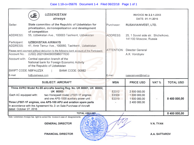 فروش هواپیما به روساویا در اکتبر 2016 ـ مبلغ فروش هواپیما در تصویر مشخص است