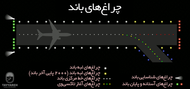 ـ چراغهای آستانه و پایان باند (Runway Threshold and End Lights): ابتدای قسمت قابل استفاده باند با ردیف چراغهای آستانه سبز رنگ مشخص شده است. چراغهای قرمز نیز انتهای باند را مشخص میکند.