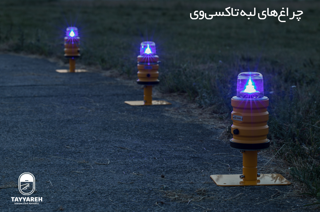 ـ چراغهای آبی: چراغهای لبه تاکسیوی همیشه آبی تیره هستند. چراغهای تاکسی آبیرنگ از ترمینال به راحتی قابل مشاهده هستند و غالبا نخستین چراغهای فرودگاهی هستند که مسافران آن را مشاهده میکنند. چراغهای تاکسی آبی معمولاً هنگام تاریکی یا در هوای بد روشن میشوند. در بسیاری از فرودگاهها چراغهای آبی همهچیز لازم برای علامتگذاری تاکسیویها هستند.