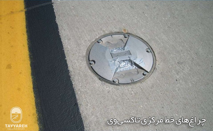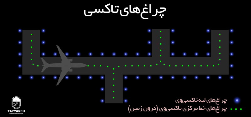 ـ چراغهای سبز: چراغهای سبز وسط تاکسیوی که در داخل زمین کار گذاشته شدهاند غالبا در فرودگاههای شلوغ و فرودگاههایی که دارای آبوهوای بد هستند و به منظور افزایش راهنمایی و ایمنی تاکسی کردن نصب شدهاند. برخلاف چراغهای آبی که برای شناسایی لبههای تاکسی استفاده میشود، چراغهای وسط سبز رنگ، بسیار روشن و نورانی هستند و خلبانان میتوانند در بدترین شرایط آب و هوایی، روز یا شب، آنها را ببینند و از آنها پیروی کنند.