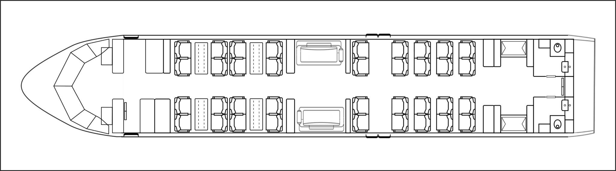 هواپیما دارای 36 صندلی بیزنس در دو بخش جلویی و عقبی کابین و دو مبل دیوان (با قابلیت تختخواب شدن) در بخش میانی کابین است.