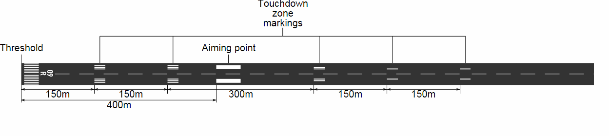 6. منطقه فرود (Touchdown Zone): این منطقه که با سه، دو و سپس یک نوار میلهای نازک و متقارن که در دو طرف خط مرکزی باند و با فاصله 500 فوت (152 متر) از یکدیگر کشیده شده است، محدودهای است که در هنگام عملیات فرود، چرخ هواپیما مجاز است در آن محدوده زمین را لمس کند.