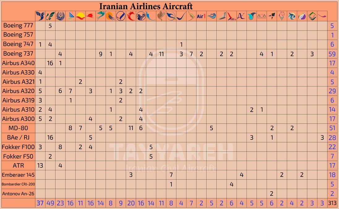 جدول ناوگان شرکتهای هواپیمایی ایران