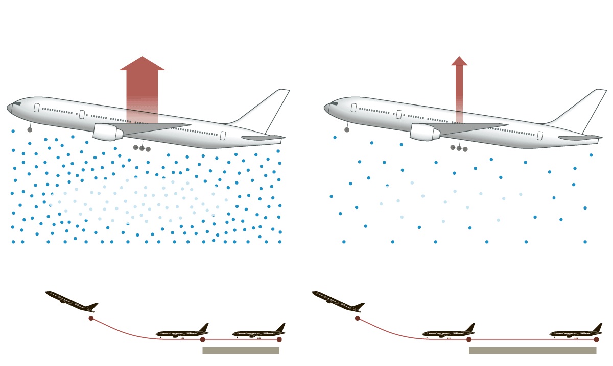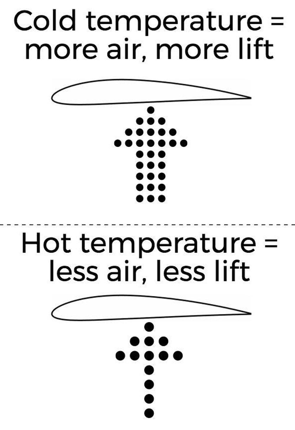 هنگامیکه هوا گرم میشود، انبساط یافته و بناربراین مولکولهای کمتری در زیر بال هواپیما وجود خواهند داشت.
